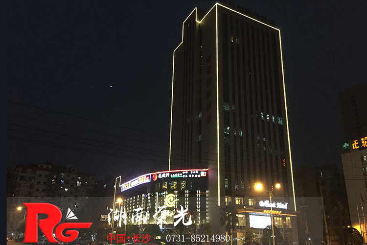 長(zhǎng)沙酒店亮化 戶(hù)外亮化設(shè)計(jì) LED夜景亮化安裝及施工工程采用IP 65防護(hù)等級(jí)的LED線(xiàn)條燈,十字星光燈搭配設(shè)計(jì)。燈具色溫采用冷、暖色搭配設(shè)計(jì),主線(xiàn)條燈勾勒出建筑亮化的輪廓,采用暖色星光燈營(yíng)造長(zhǎng)沙酒店亮化的溫馨氛圍。